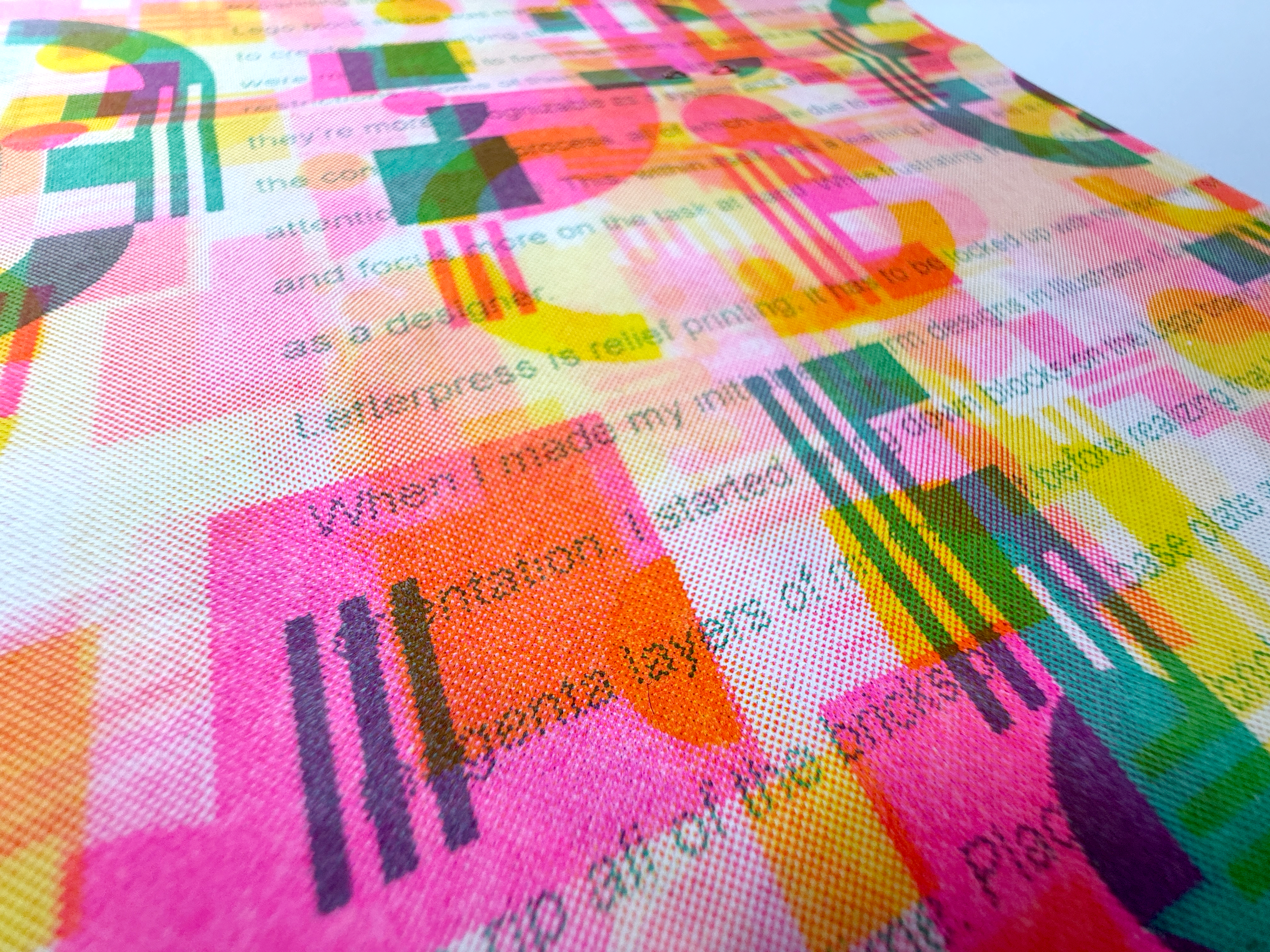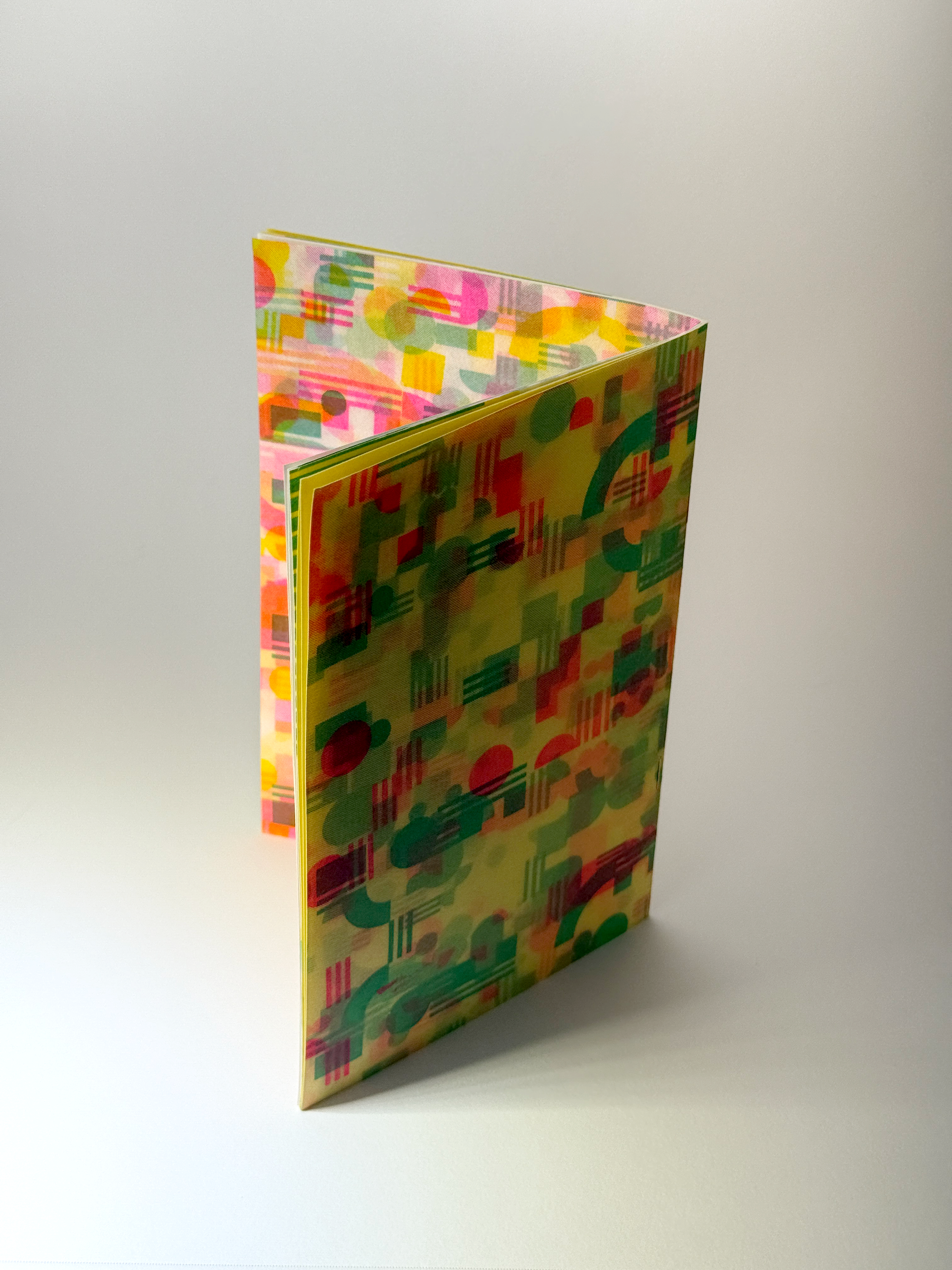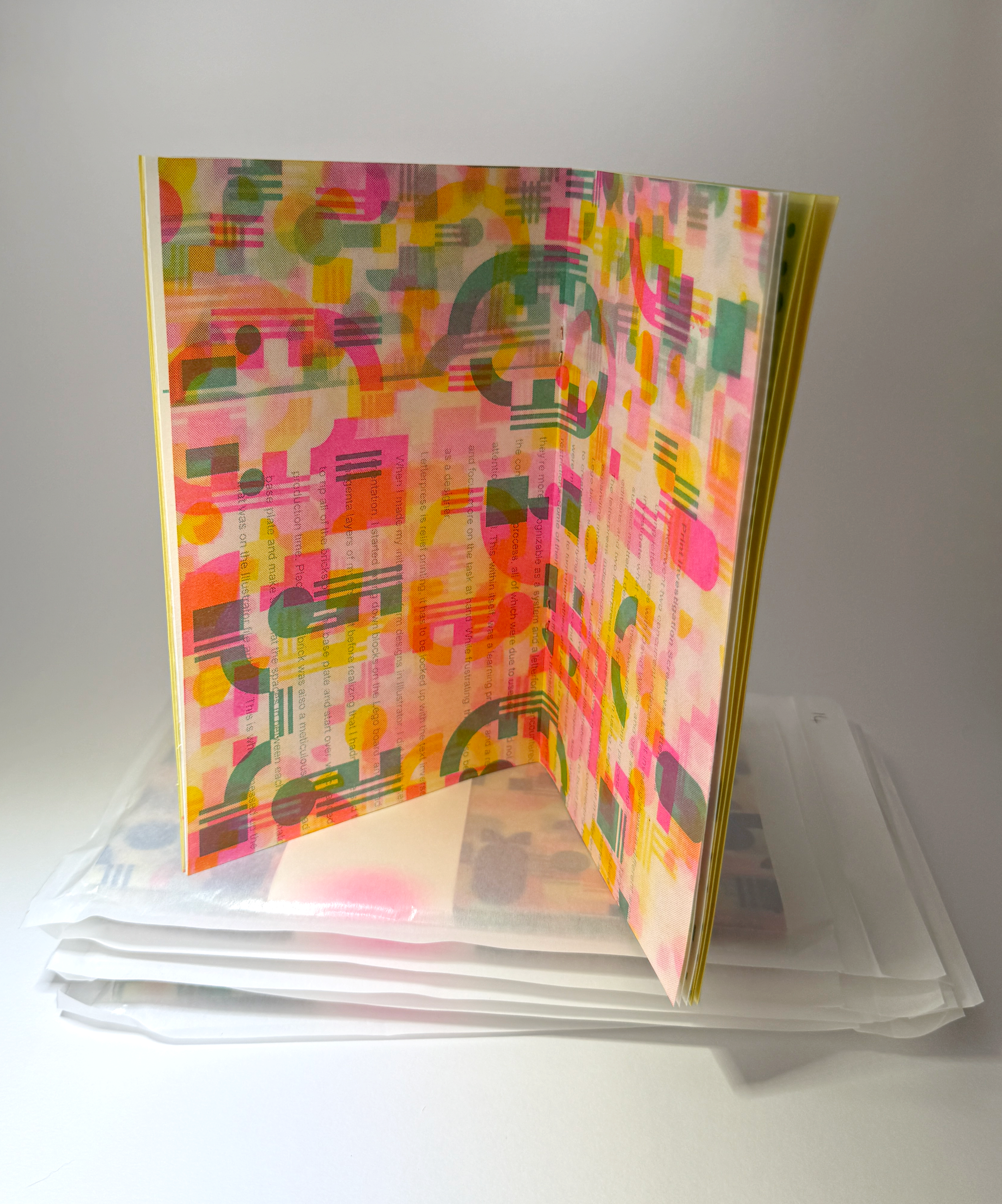 For this project, I wanted to re-purpose acetate used in a previous screenprinting project and experiment with how the shapes on the acetate would layer on the risograph scanner. I used this method to create my spread of the collaborative zine, and in addition I used this method to create both covers of the publications.